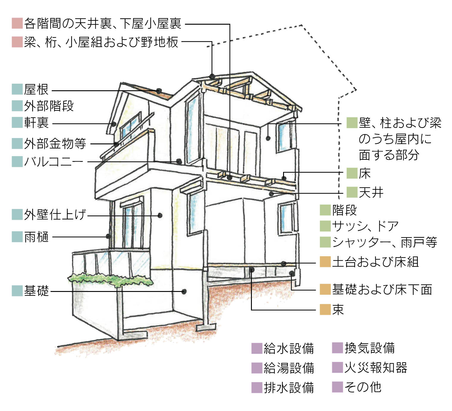 一戸建て住宅の主な住宅診断項目は以下の大きく5項目、詳細には100項目以上の診断を行います。基本的に見られるものは全部見て、さわれるものには全部さわって確認します。